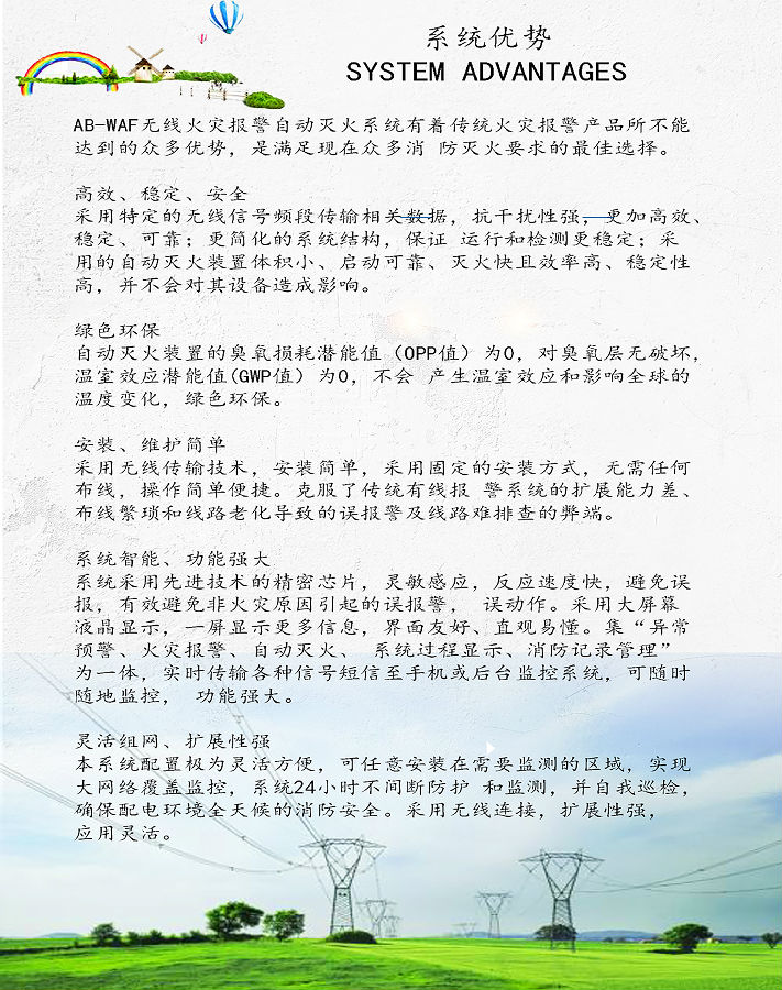 AB-WAF无线火灾报警自动灭火系统是集微电子传感技术、现代网络及无线通信技术、分布式信息处理技术、微电脑控制于一体的智能化、功能化的新一代电气火灾消防产品,既可独立使用也可与控制中心联网使用。